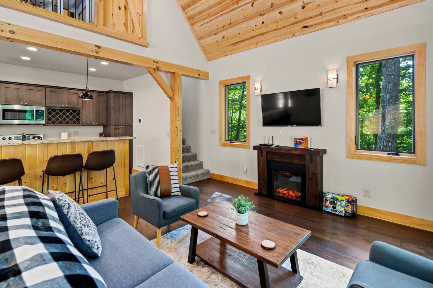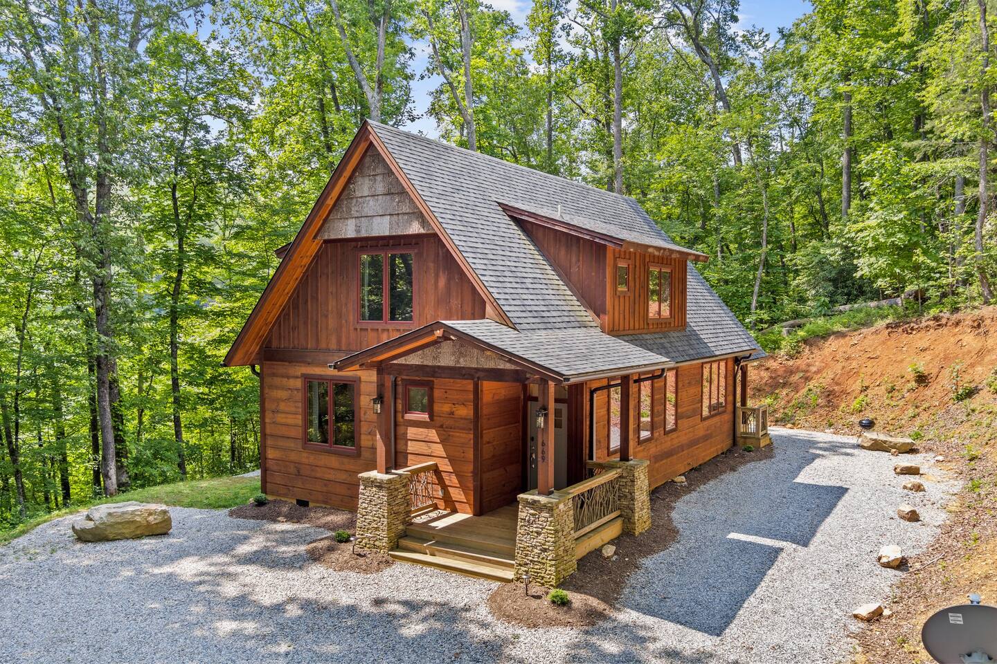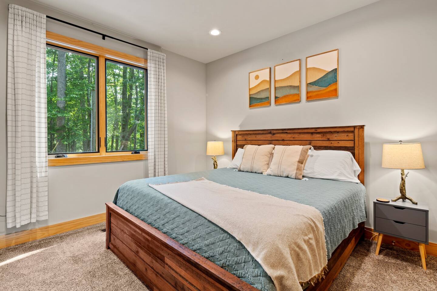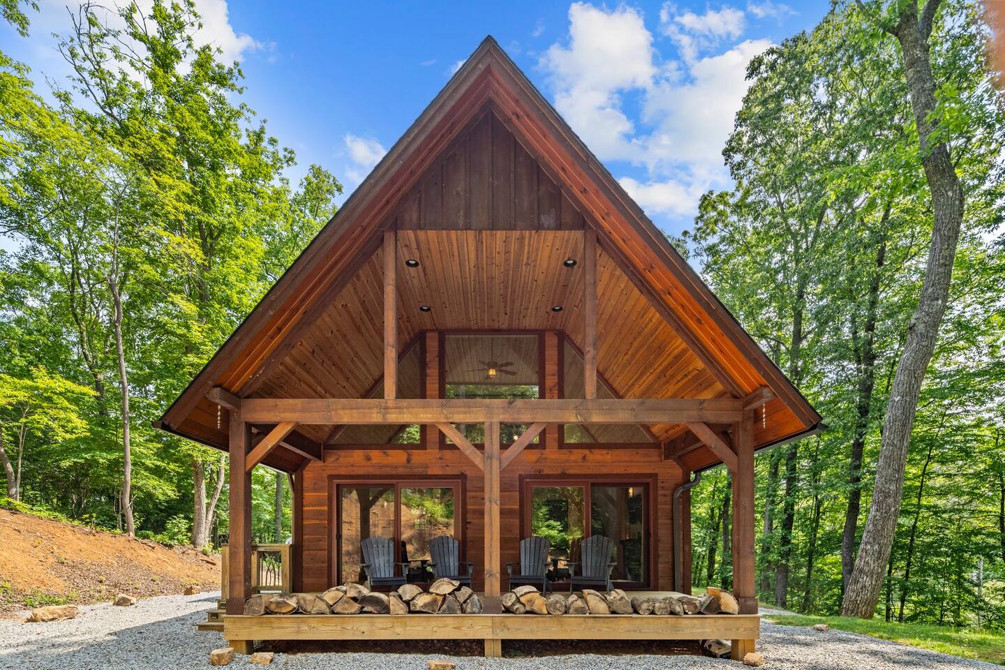 This craftsman-style cabin has a 1st floor primary bedroom with a King bed and en-suite. Two additional bedrooms with Queen beds and a shared bathroom are located upstairs. There is a small overlook from one of the upstairs bedrooms that has sliding doors to allow for privacy or open up to the living room. The kitchen is fully equipped with stainless steel appliances, cookware, dinnerware, spices, tea, drip coffee maker, kid-friendly dishes and more. There is also a washing machine and dryer available for use with detergent. Roku Smart TV’s in every room with cable and streaming capabilities. Outside, enjoy the fire pit or cook dinner on the charcoal grill just off of the covered back deck.