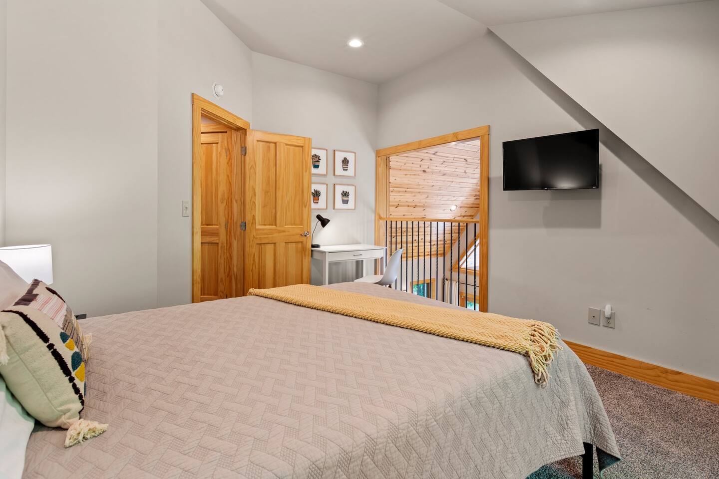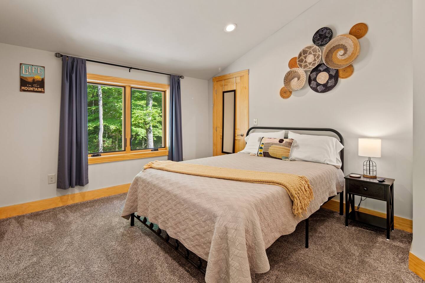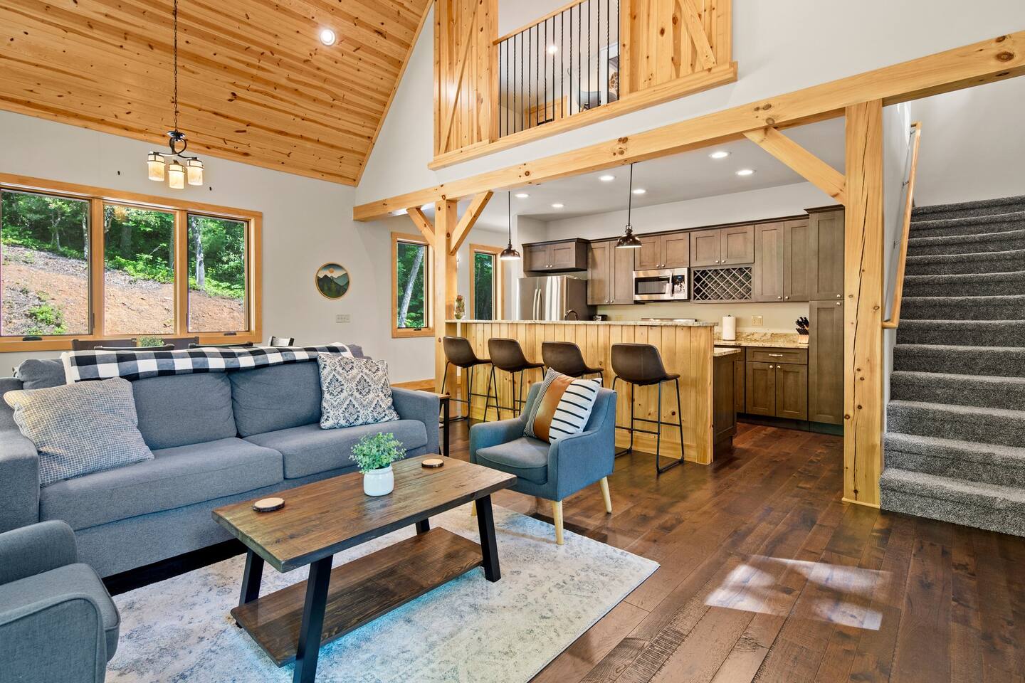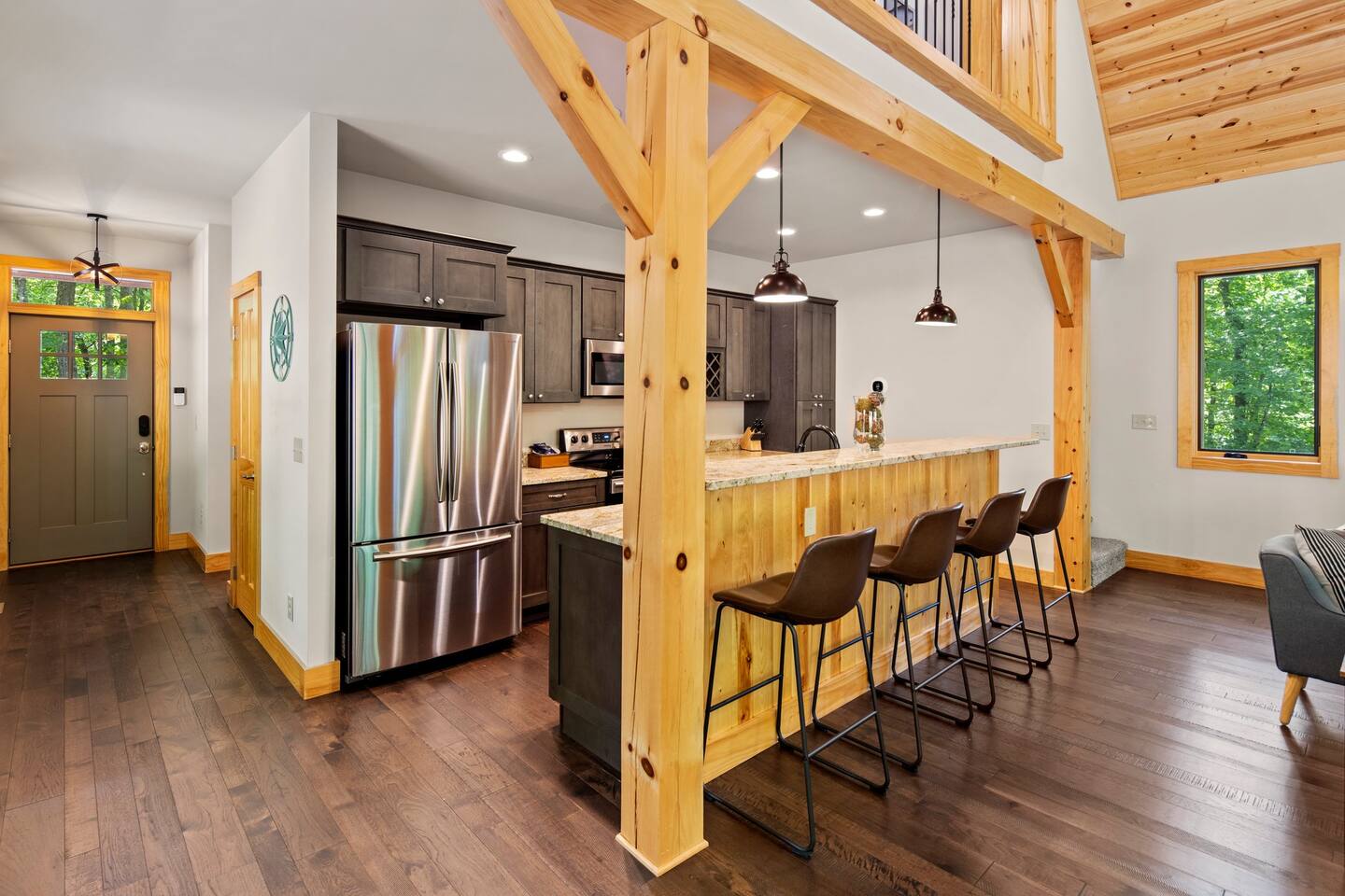 This craftsman-style cabin has a 1st floor primary bedroom with a King bed and en-suite. Two additional bedrooms with Queen beds and a shared bathroom are located upstairs. There is a small overlook from one of the upstairs bedrooms that has sliding doors to allow for privacy or open up to the living room. The kitchen is fully equipped with stainless steel appliances, cookware, dinnerware, spices, tea, drip coffee maker, kid-friendly dishes and more. There is also a washing machine and dryer available for use with detergent. Roku Smart TV’s in every room with cable and streaming capabilities. Outside, enjoy the fire pit or cook dinner on the charcoal grill just off of the covered back deck.