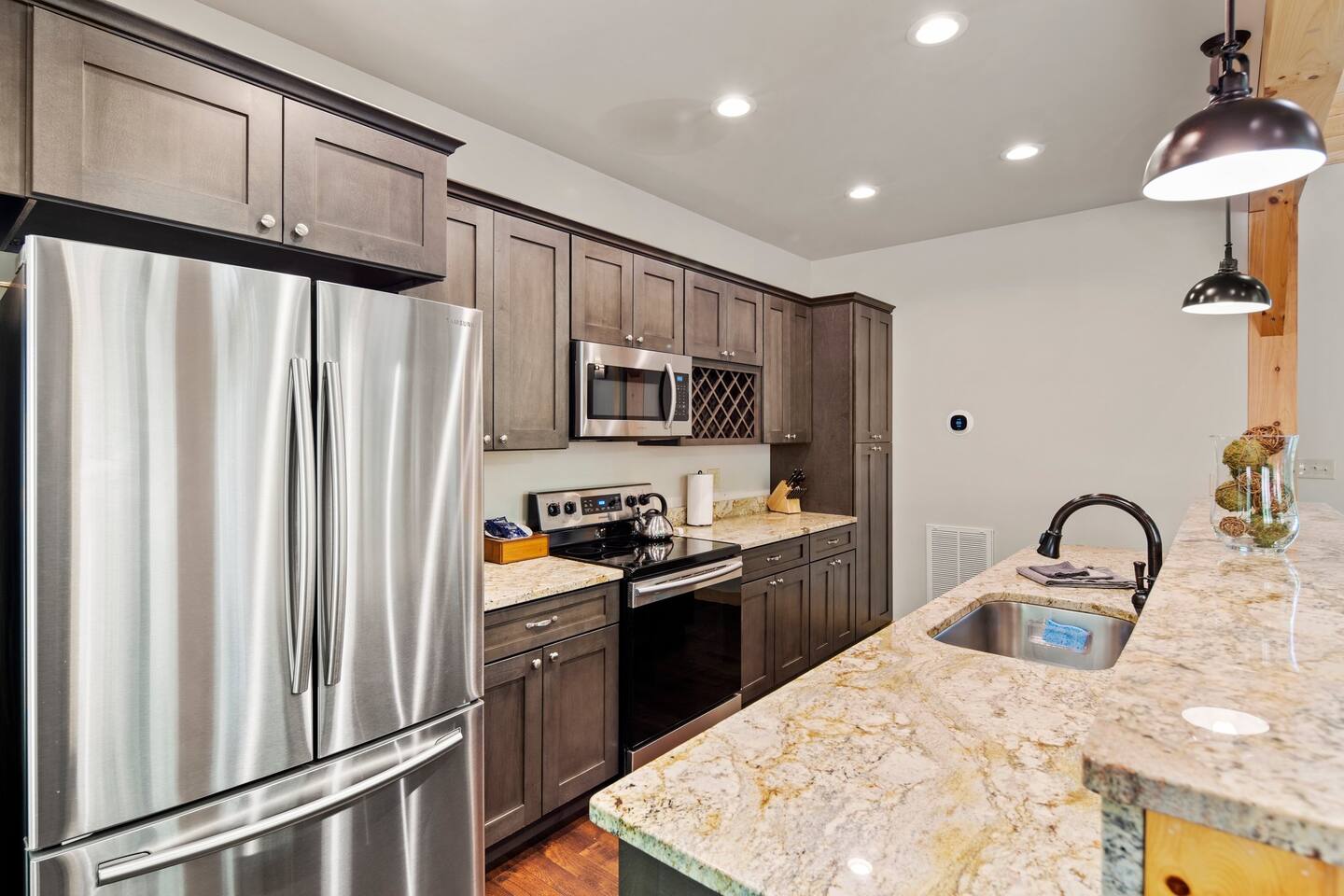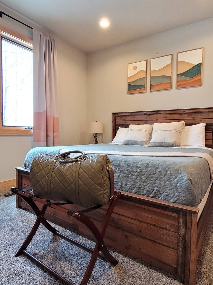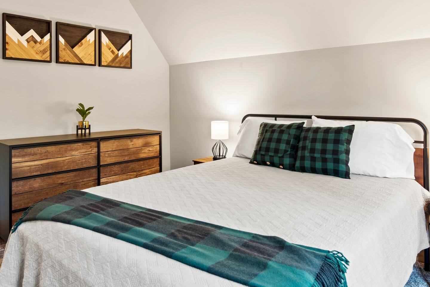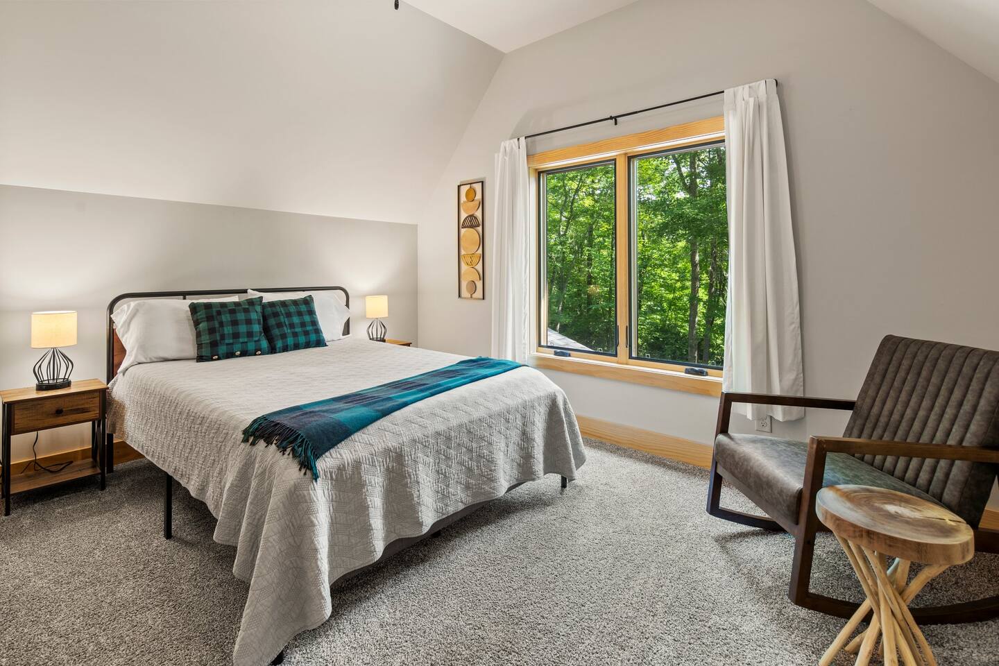 This craftsman-style cabin has a 1st floor primary bedroom with a King bed and en-suite. Two additional bedrooms with Queen beds and a shared bathroom are located upstairs. There is a small overlook from one of the upstairs bedrooms that has sliding doors to allow for privacy or open up to the living room. The kitchen is fully equipped with stainless steel appliances, cookware, dinnerware, spices, tea, drip coffee maker, kid-friendly dishes and more. There is also a washing machine and dryer available for use with detergent. Roku Smart TV’s in every room with cable and streaming capabilities. Outside, enjoy the fire pit or cook dinner on the charcoal grill just off of the covered back deck.